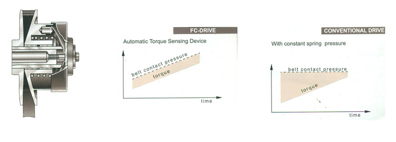 L'entraîneur a des caractéristiques uniques du «dispositif automatique de détection de couple», ce qui assure une pression axiale automatique de contact optimale sur la ceinture, selon le taux de la puissance à transférer. Plus le couple, plus est la pression de contact. Cela garantit que la ceinture ne glisse pas pendant le fonctionnement intermittent, sous une charge excessive ou lorsque la machine commence à l'effet de volant d'inertie. Ces caractéristiques du système garantit un rendement très élevé, même à la charge partielle et la durée de vie de la ceinture.